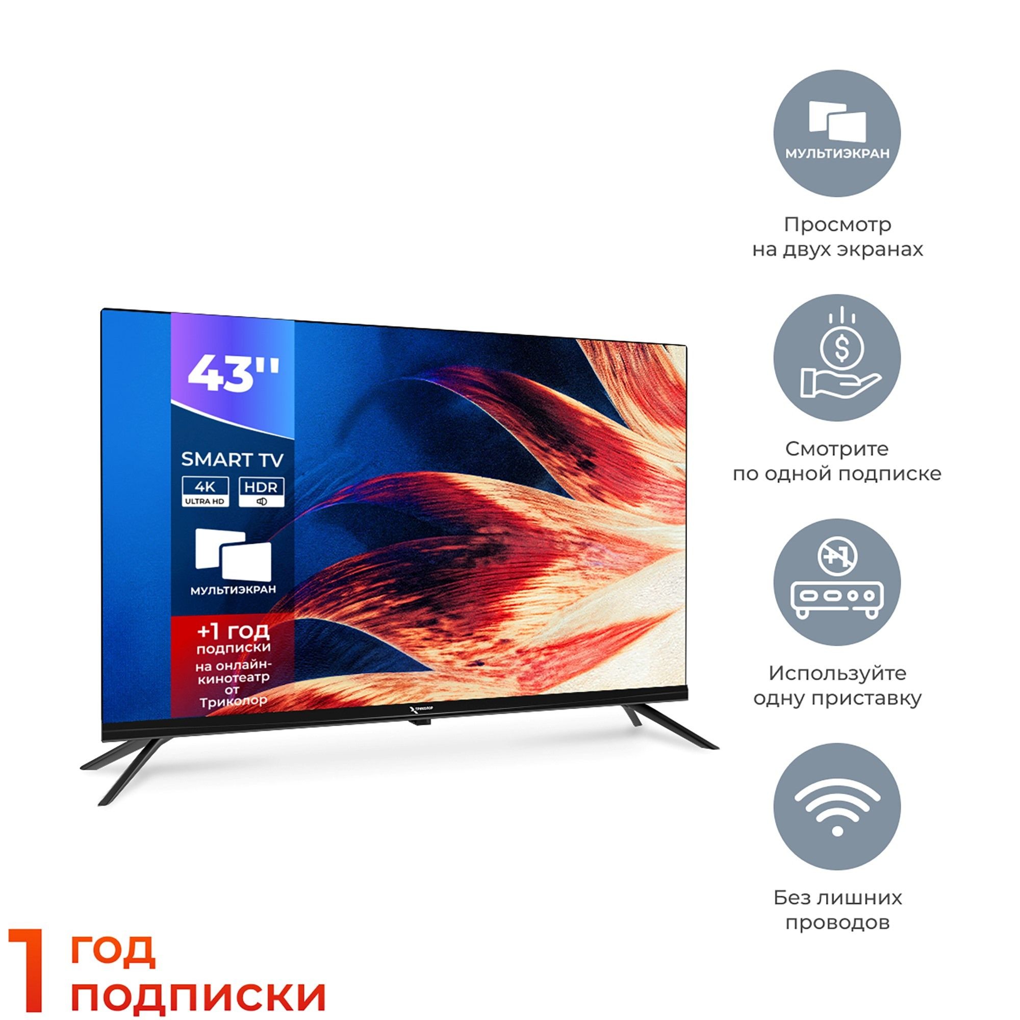 SMART телевизоры с диагональю 43 дюйма оснащены QLED-матрицами, которые обеспечивают более яркие цвета, глубокий черный и увеличенную контрастность по сравнению с DLED. Разрешение 4K гарантирует четкость и детализацию изображения. Поддерживается установка APK-файлов, а также доступен встроенный магазин приложений. Улучшенные технологии обработки изображения обеспечивают плавность видео и реалистичность движений. В стоимость входит подписка Color+.